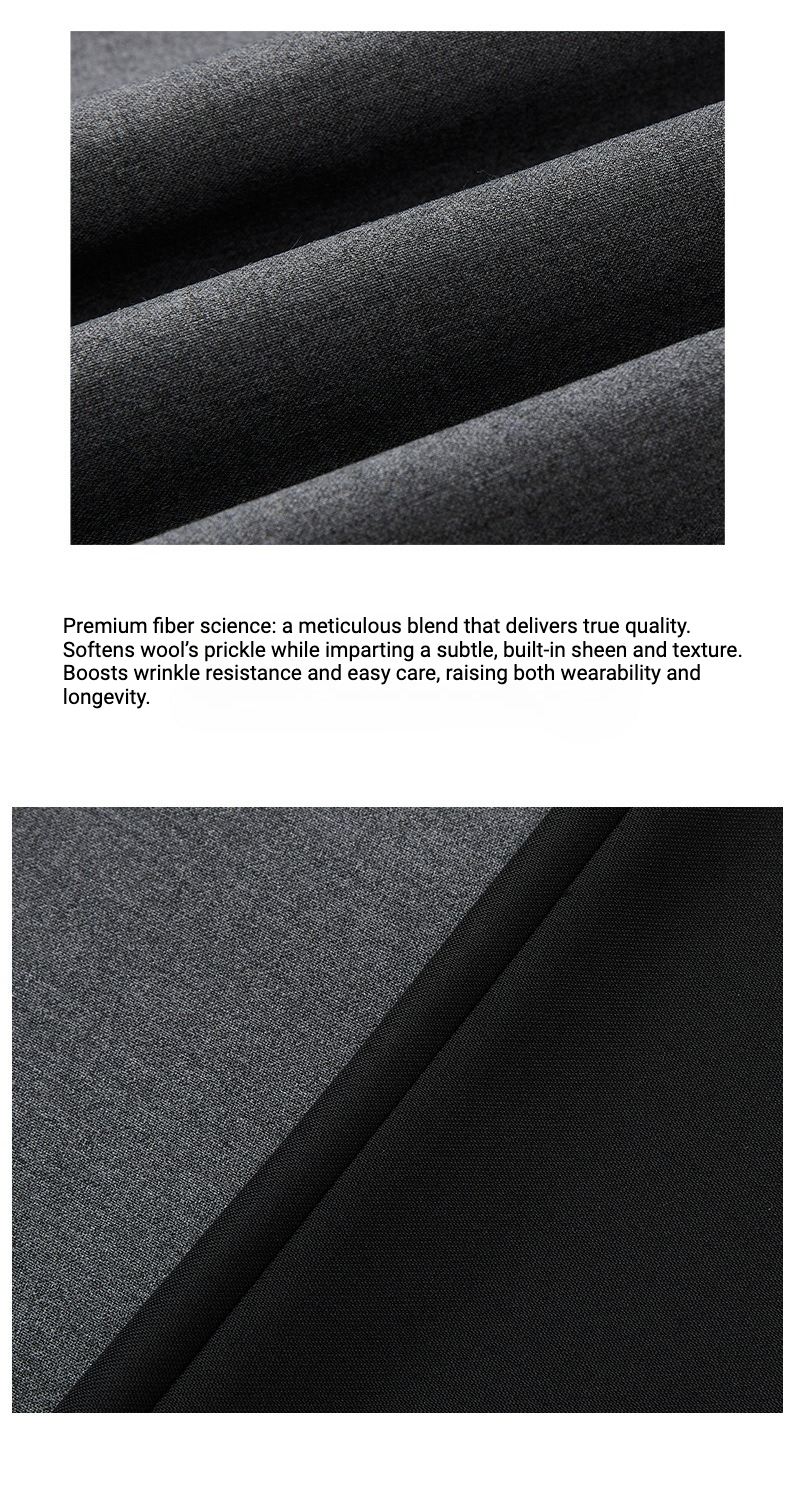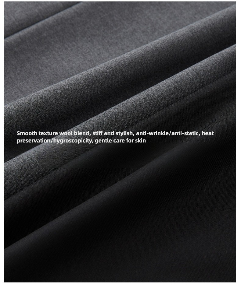 - Wool-blend fabric: warm, wrinkle & static-resistant