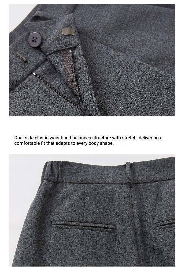These straight-leg trousers feature a 30% wool blend fabric, offering warmth, wrinkle resistance, and a sleek texture. The mid-high waist design elongates leg lines, while the single front pleat and side elastic waist ensure a comfortable, figure-flattering fit for various body typesÂ